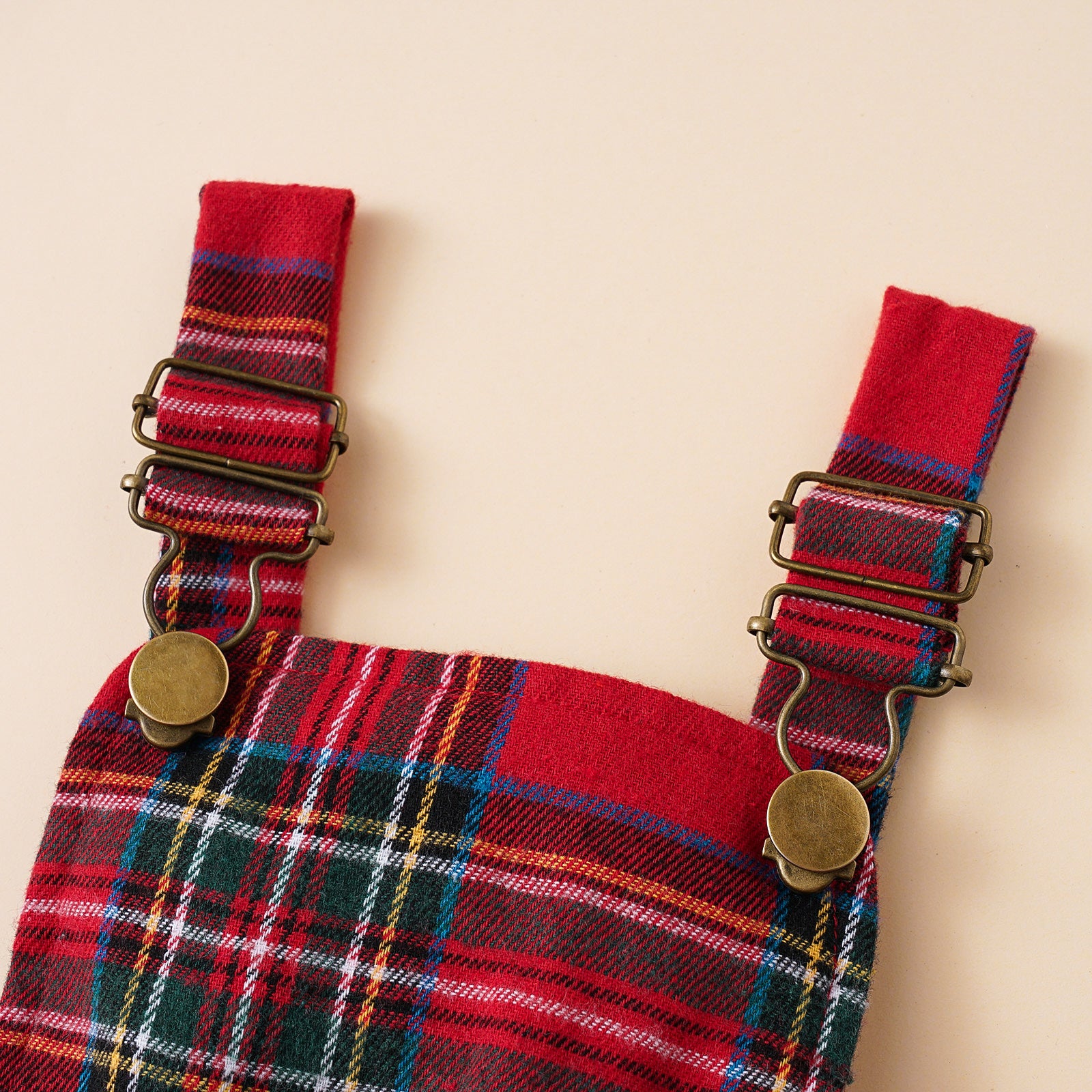 Un conjunto navideño lleno de encanto y comodidad. Incluye un body rojo de manga larga con volantes en los hombros, una falda escocesa con tirantes y una vincha a juego. Ideal para sesiones de fotos, celebraciones y regalos navideños.