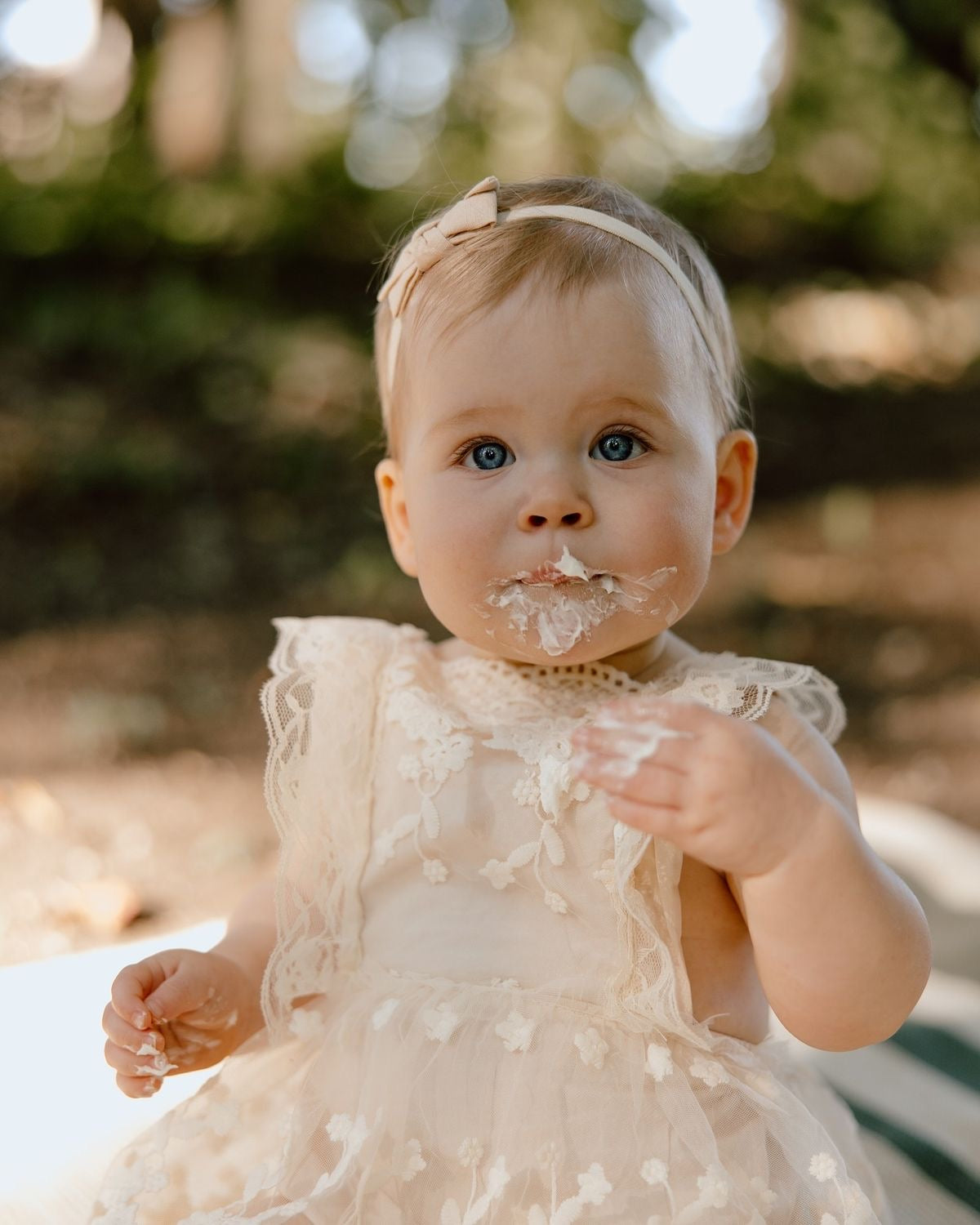 Este enterizo color beige suave destaca por su delicado encaje floral bordado que cubre tanto el cuerpo como la faldita, creando un efecto romántico y sofisticado. Los volantes laterales en los tirantes y el acabado en ondas del dobladillo le dan un toque vintage digno de una ocasión especial. Ideal para eventos, bautizos, cumpleaños o sesiones de fotos.
