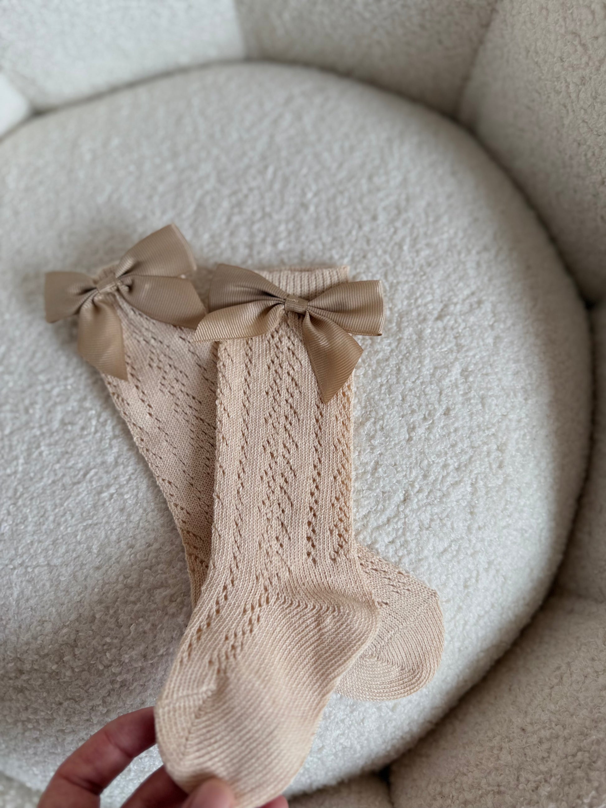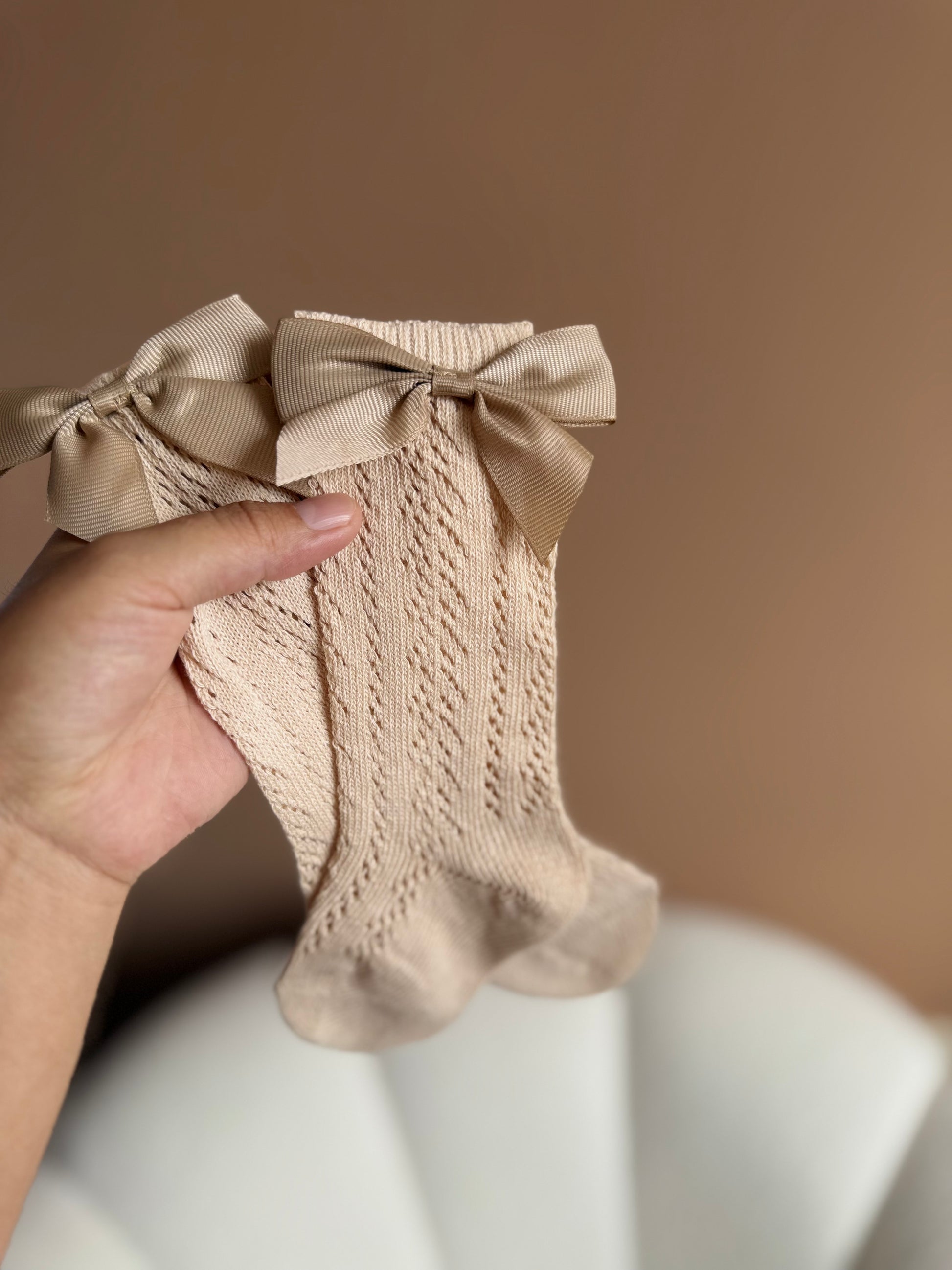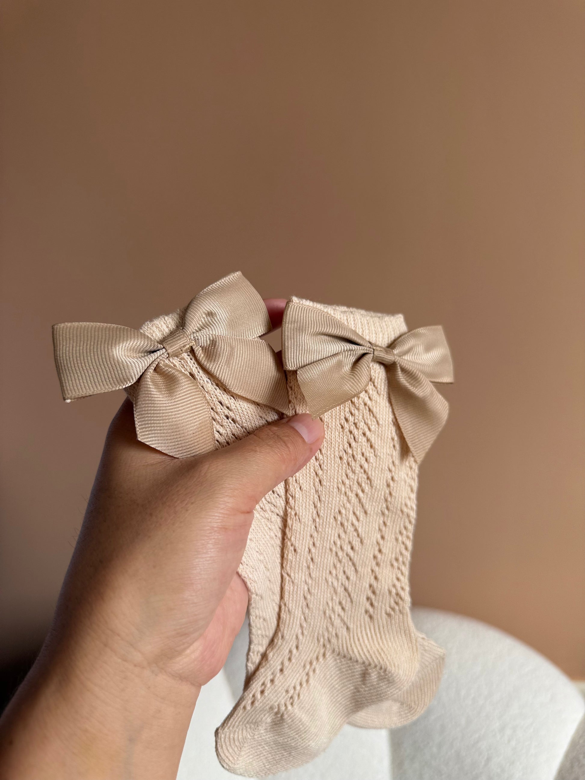 Un diseño delicado y lleno de encanto. Estas medias en tono beige suave combinan un tejido calado que aporta un toque clásico y femenino, acompañado de un lazo elegante que realza su estilo. 🌷 Perfectas para complementar los looks más tiernos y especiales de tu pequeña.