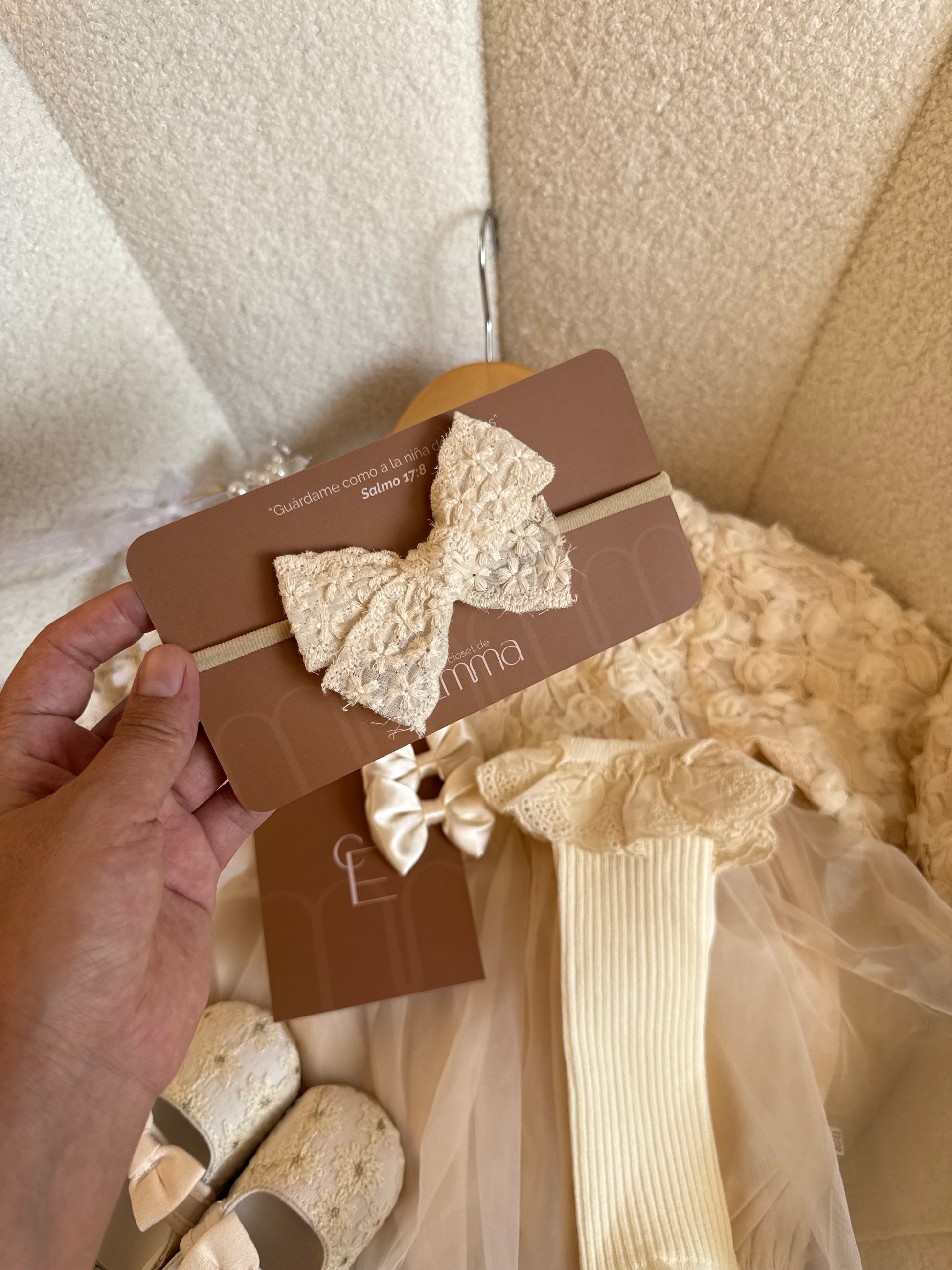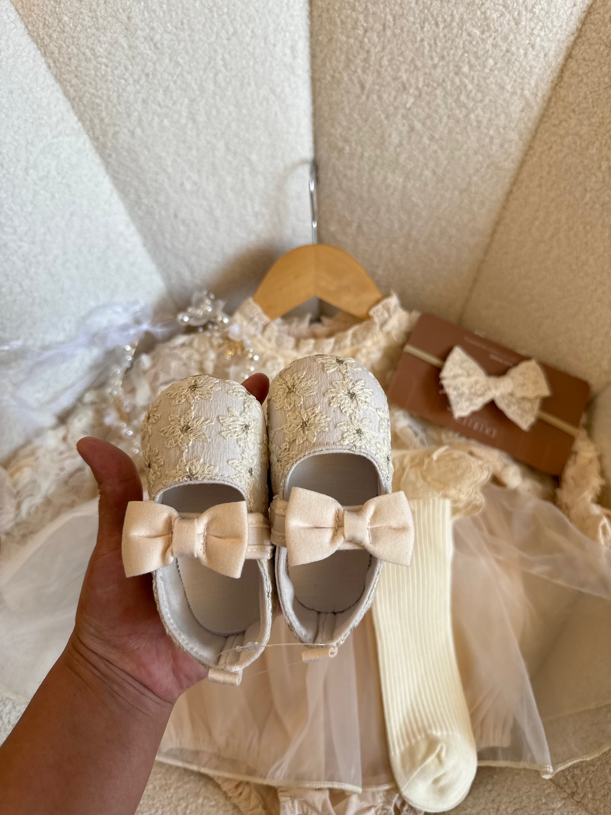 Un conjunto elegante y delicado pensado para el día más especial de tu bebé. Incluye un vestido perla con detalles florales en encaje 3D, tul suave, y cierre con broches en la parte inferior. Se complementa con zapatitos bordados, pantymedia con encaje, vincha y lazo a juego para un look angelical y perfecto.