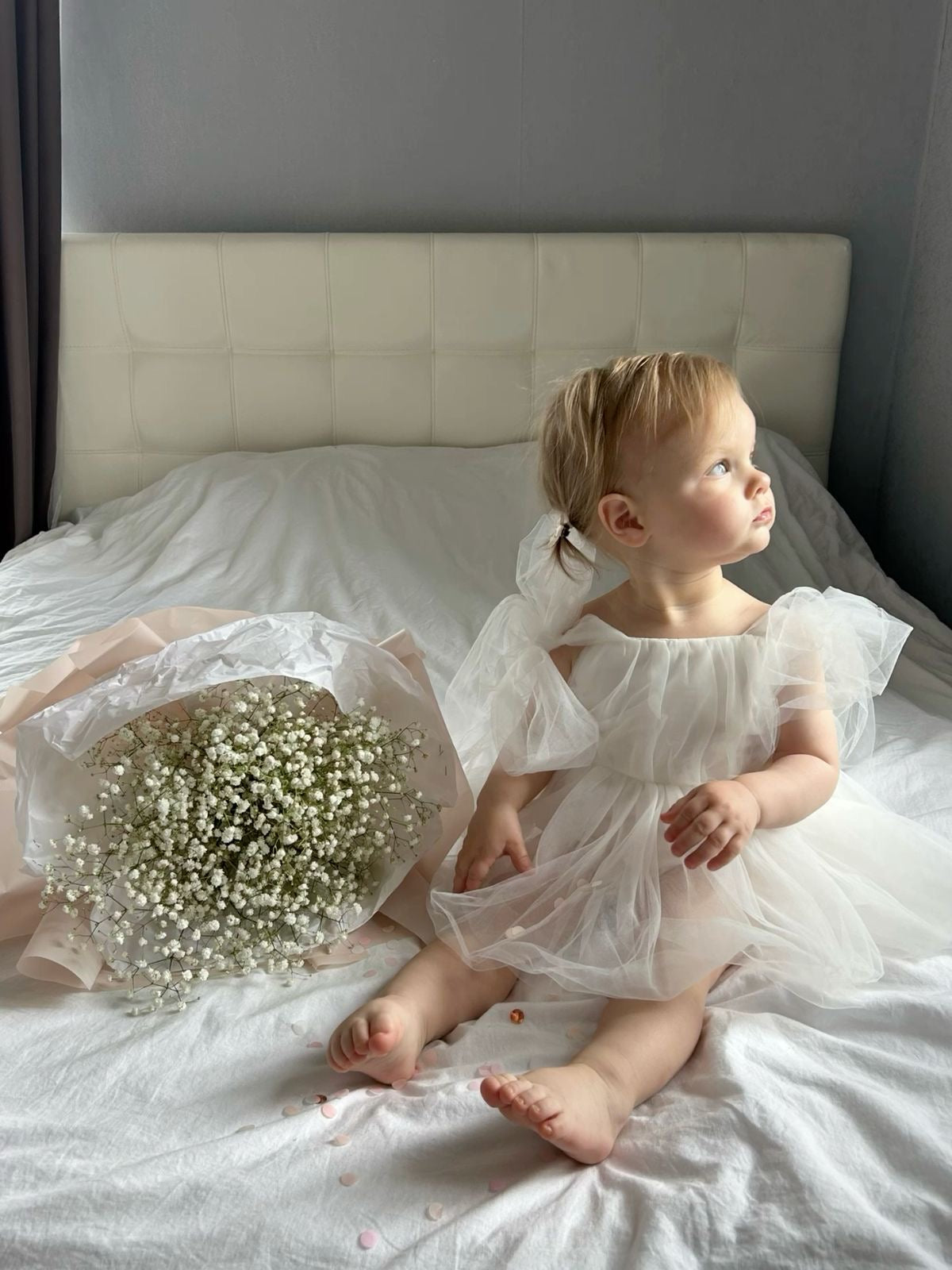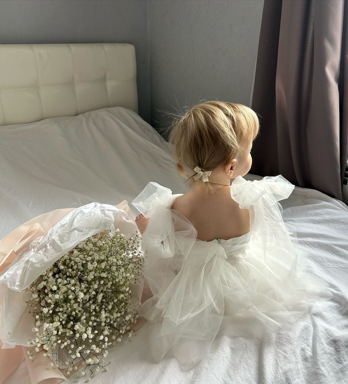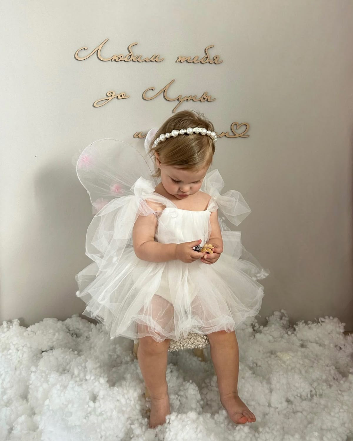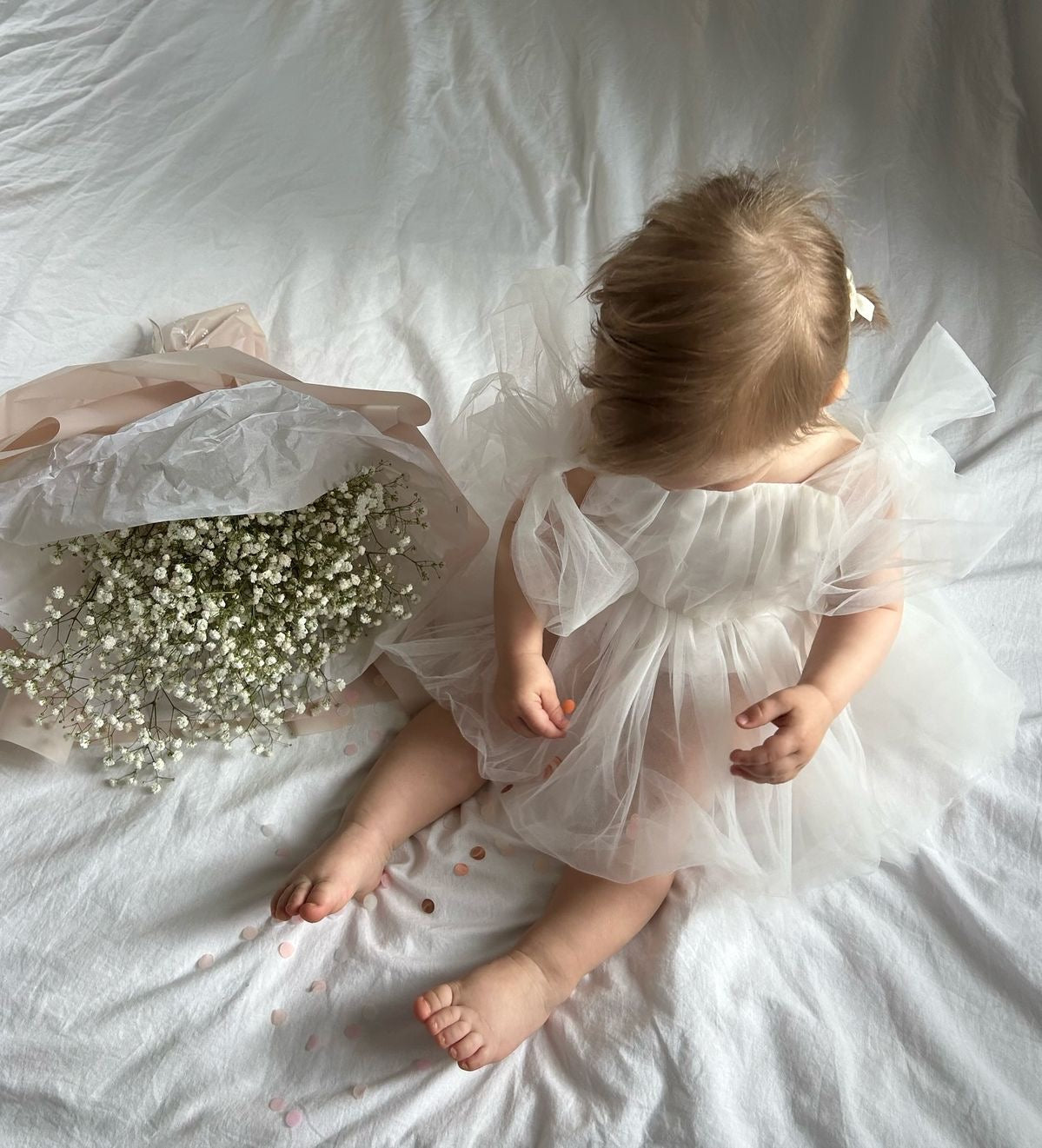 Un sueño hecho vestido para las más pequeñas. Este delicado diseño en tul rosa presenta un cuerpo plisado, falda vaporosa y adorables lazos en los hombros que lo convierten en una prenda ideal para sesiones de fotos, cumpleaños o momentos especiales.