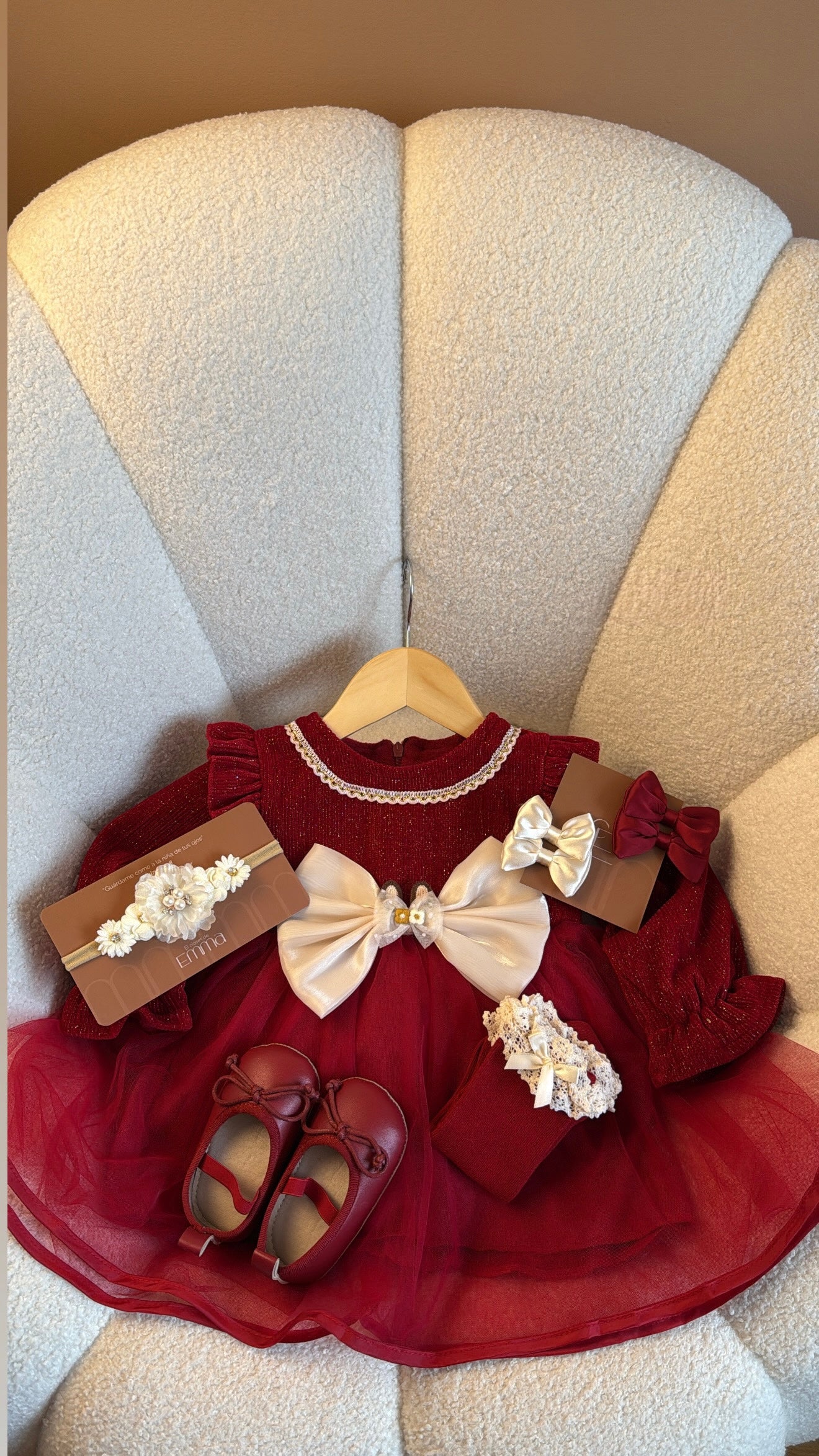 Un vestido que derrocha elegancia y encanto. Confeccionado en terciopelo rojo suave en la parte superior y falda de tul con vuelo, está adornado con un gran lazo marfil en el centro, decorado con detalles perlados. Sus mangas largas con volantes y el delicado ribete en el cuello lo convierten en la elección perfecta para ocasiones especiales.