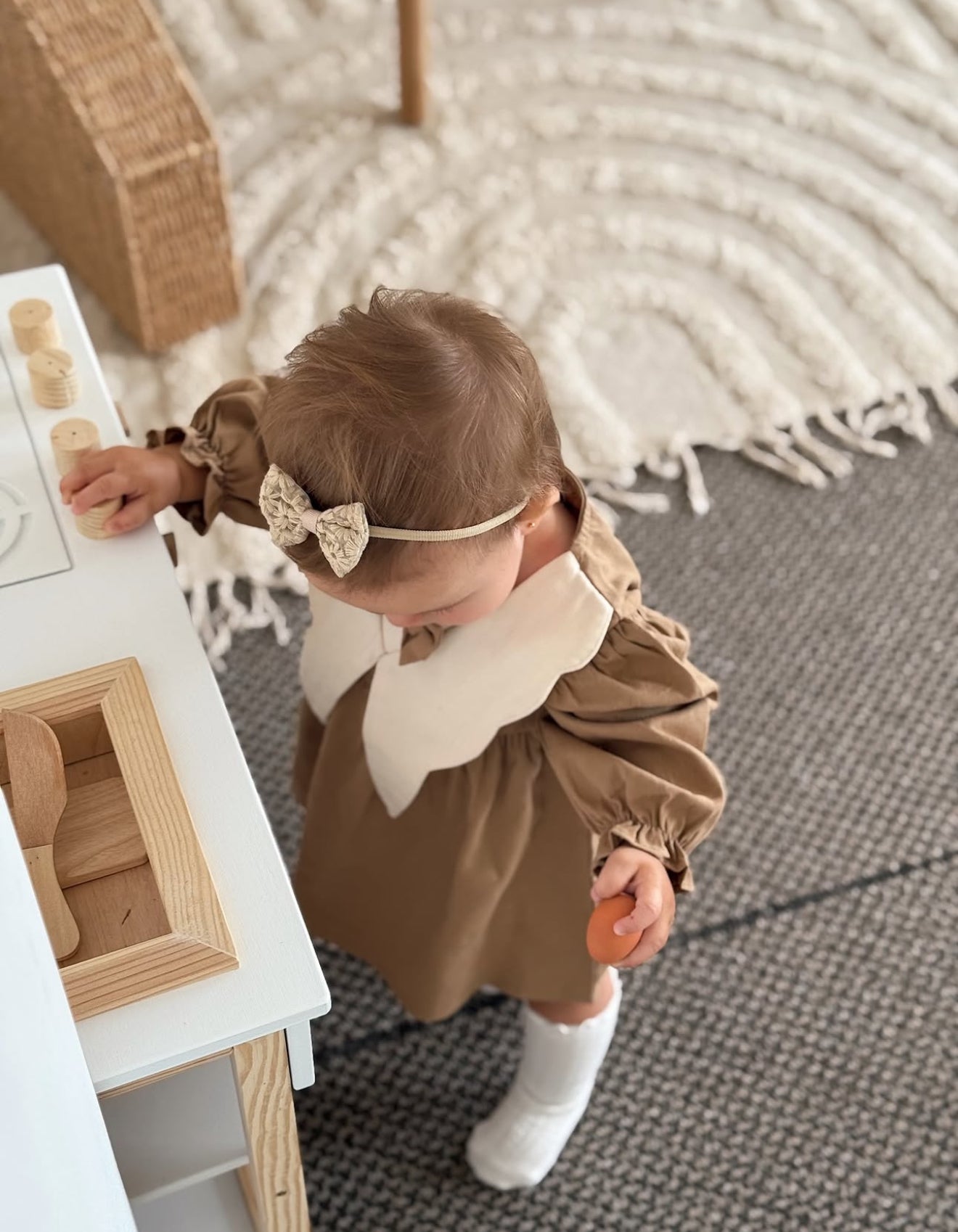 Un vestido encantador que combina la calidez del tono caramelo con la delicadeza de un cuello beige en forma alargada, rematado con un pequeño lazo que aporta un toque dulce y elegante. Sus mangas abullonadas con elástico añaden volumen y comodidad, ideal para que tu pequeña se mueva libremente.